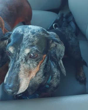 “Samantha” is a female dachshund mix with a short black and white coat.