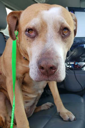 “Goldie” is a senior female pit bull terrier mix with a blonde and white coat.