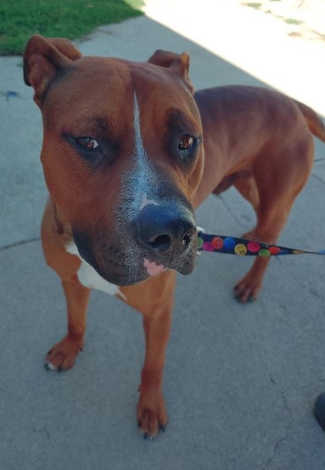 “Dexter” is a male pit bull terrier mix with a short red coat.