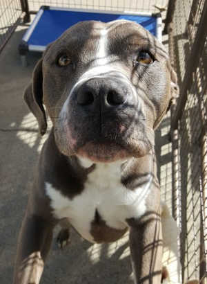 “Tyson” is a male American Staffordshire terrier mix with a medium-length gray and white coat.