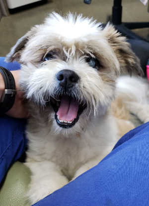 “Pete” is a male Shih Tzu with a shaved tan and white coat.