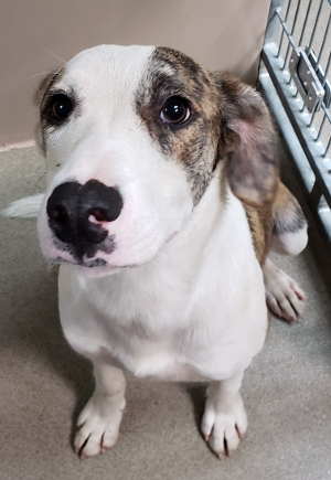 “Boots” is a male border collie and Labrador Retriever mix with a short white and brindle coat.