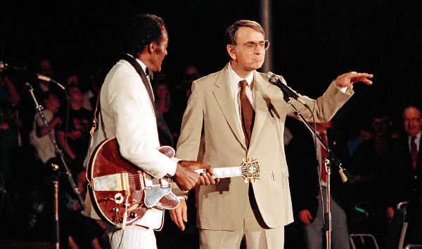 The next morning, Vice President Dan Quayle visited the Lab to commend the Voyager team. That night, Chuck Berry, whose song "Johnny B. Goode" was included on the Golden Record that flew with both Voyagers, played at JPL's celebration of the feat.