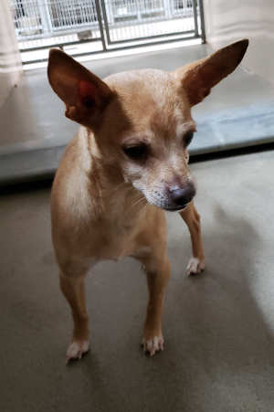 “Rico” is a senior male Chihuahua with a short tan coat.