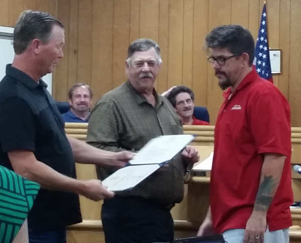 From left, city of Lakeport Parks Foreman Ron Ladd with his new Emergency Management Specialist Training Certificate, Lakeport Public Works Director Doug Grider and Lakeport Mayor Tim Barnes at the Lakeport City Council meeting on Tuesday, August 20, 2019. Photo by John Jensen/Lake County News. LAKEPORT, Calif. – The Lakeport City Council on Tuesday honored the city of Lakeport’s parks foreman who has earned a state certification for emergency management.