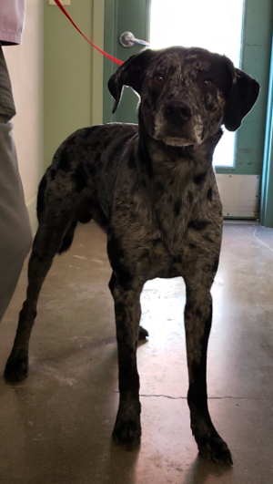 “Beau” is a male Catahoula Leopard Dog with a blue merle coat.
