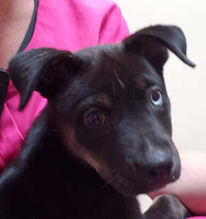 This female husky mix has a short tricolor coat.