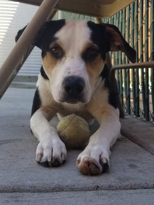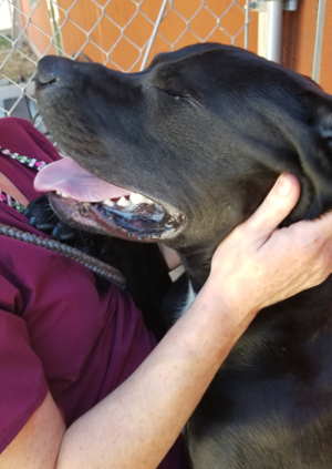 “Rocky” is a male pit bull-mastiff with a short black coat.