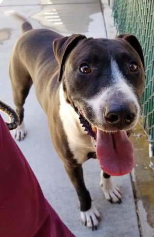 “Cash” is a male pit bull terrier mix with a short black and white coat.