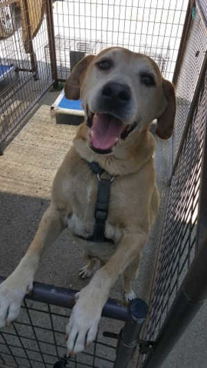 “Marley” is a male Labrador Retriever mix with a short tan coat.