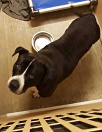 “Panther” is a female Staffordshire Bull Terrier mix with a short black and white coat.