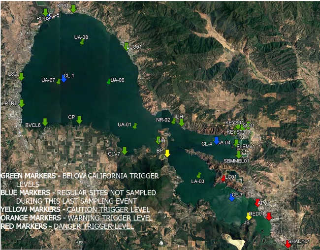 – Cache Creek Shady Acres/SHADY01 with preliminary testing using Abraxis strips on July 26 due to changing lake conditions indicating a level of over 30 µg/L - danger zone (red).