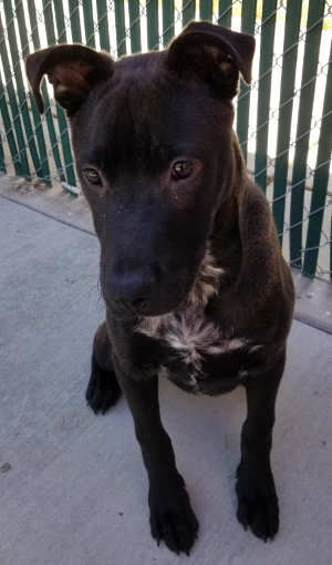 “Buddy” is a male Labrador Retriever mix with a short black coat with white markings.