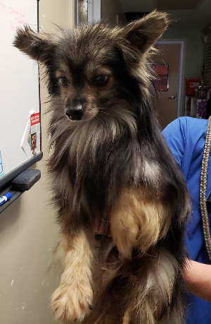 This senior male Pomeranian-Chihuahua mix has a long black and brown coat.