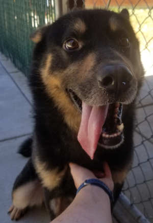“Koda” is a male German Shepherd-husky mix with a medium-length black and brown coat.
