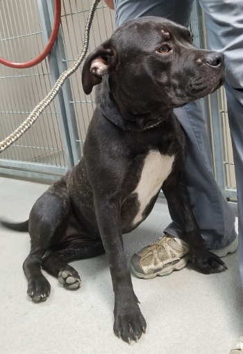 “Cash” is a male pit bull terrier mix with a short black and white coat.