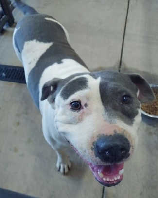 “Lola” is a female American Staffordshire Terrier mix with a short white and gray coat.