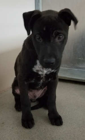 “Bear” is a male Labrador Retriever with a short black coat with white markings.
