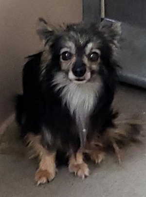 This senior male Pomeranian-Chihuahua mix has a long black and brown coat.