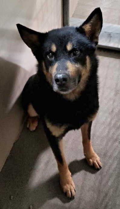 “Koda” is a male German Shepherd-husky mix with a medium-length black and brown coat.