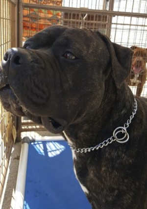 “Scorpio” is a male American Bulldog mix with a brindle coat.