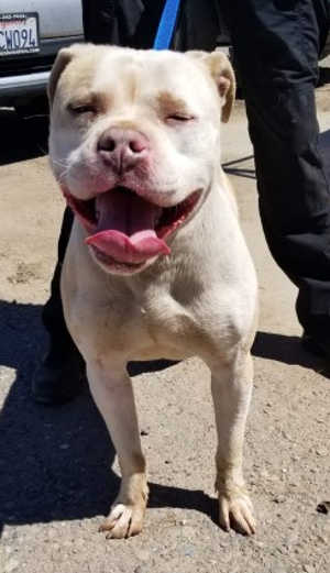 “Jason” is a male pit bull mix with a short blond and white coat.