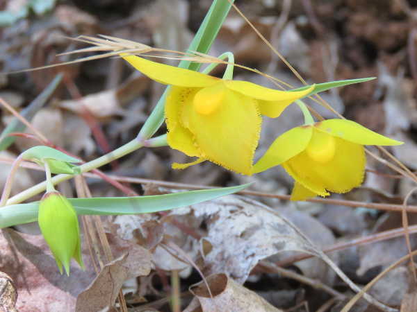 A uniquely beautiful woodland flower set amongst the dense curtain of grasses in shady areas, is Diogenes' lantern, or Calochortus amabilis. This yellow, nodding flower is also called golden fairy lantern. Endemic to California, the plant's bulb was a traditional fare of the Kashaya Pomo, or "bo" who prepared them to eat by first baking or boiling.