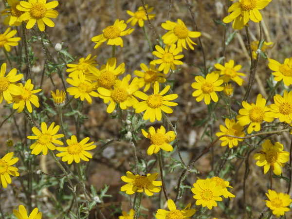 There are sprays of the yellow woolly sunflower, or Eriophyllum lanatum. These commonly found flowers thrive in parched open areas below 10,000 feet. This is a perennial plant that grows from one to two feet in height and attracts lupine ghost moths as well as geranium plume moths in certain areas.