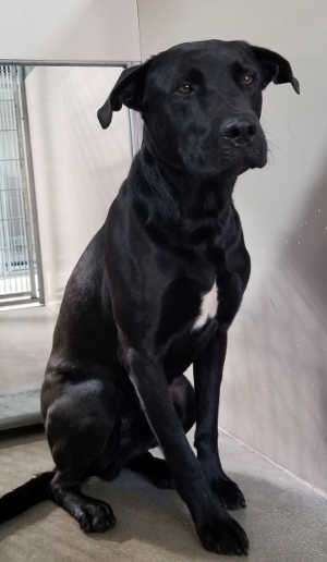 “Charlie” is a male Labrador Retriever with a black coat and white markings.