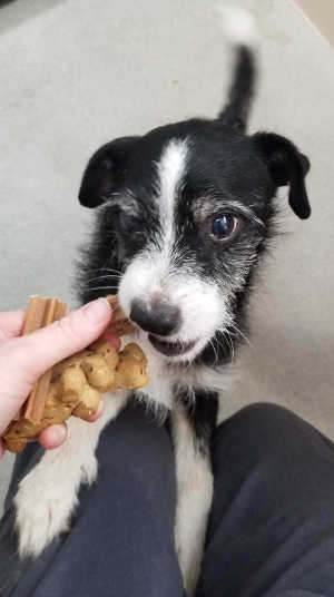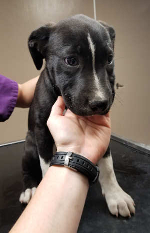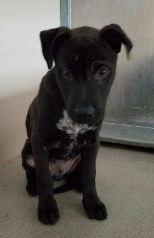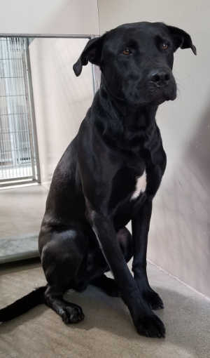 “Bear” is a male Labrador Retriever with a short black coat with white markings.