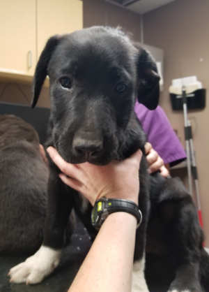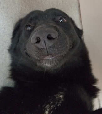 “Blaze” is a male Labrador Retriever with a short black coat and white markings.