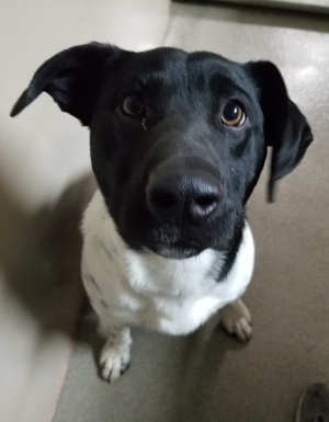 This young female Labrador Retriever has a short black and white coat.