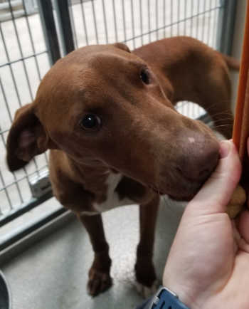 This female hound-Labrador Retriever has a short red coat.