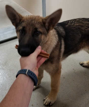 “Luna” if a young female German Shepherd with a medium-length black and tan coat.