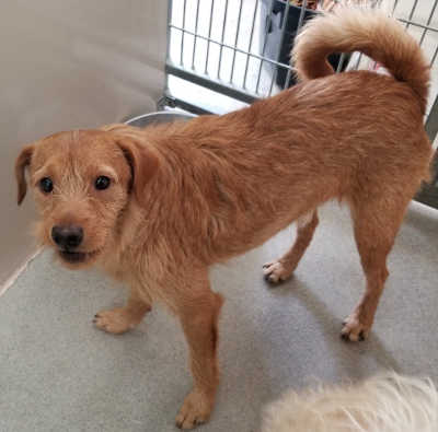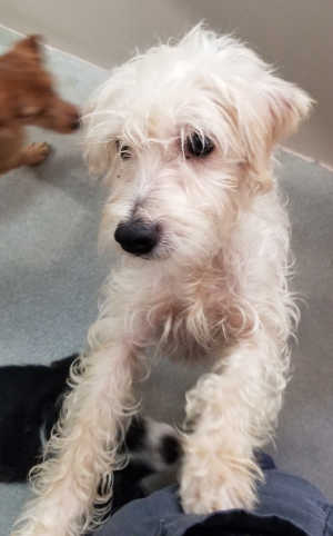 “Scooby” is a male poodle mix with a medium-length white and tan coat.