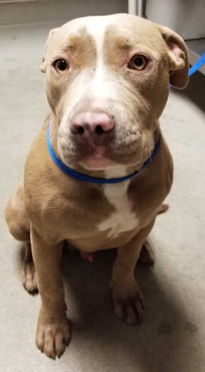 This male pit bull terrier has a short fawn and white coat.