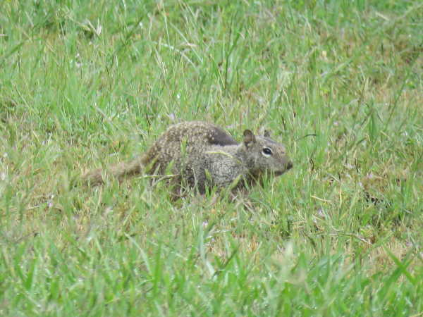 California ground squirrels are mottled brown, mixed with gray in color. They reside in burrows that they dig out and live in with other ground squirrels, however, they all have their own private entrances, and usually only ever travel 80- 200 feet from their burrows. When they enter their burrow, or become frightened they emit a chirping-type of warning call.