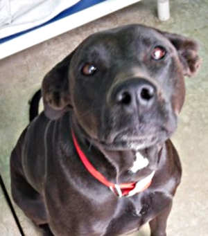 “Jett” is a female American Staffordshire Terrier mix who has been spayed.