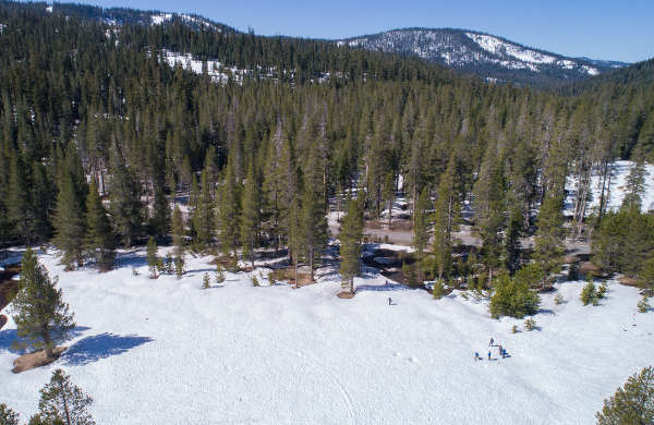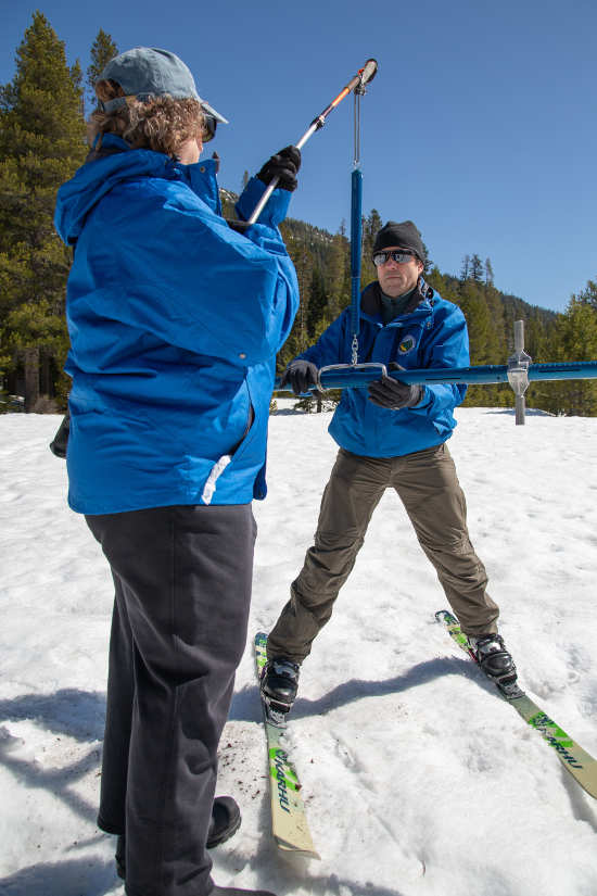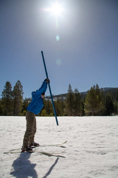 The Phillips snow course is one of hundreds that is surveyed manually throughout the winter. Manual measurements augment the electronic readings from about 100 snow pillows in the Sierra Nevada that provide a current snapshot of the water content in the snowpack.