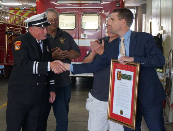 McGuire was on hand to present the framed resolution to interim Chief Rick Bergem, district firefighters and staff, and board members in the ceremony held in the engine bay of the district’s headquarters Station 50 in downtown Lakeport.