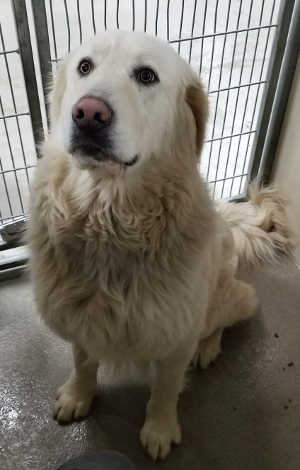 “Little Foot” is a white male Great Pyrenees with a long white coat and gold eyes.