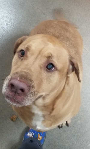 “Tina” is a female Labrador Retriever-pit bull terrier with a short yellow coat.