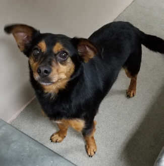 “Bubbles” is a male Chihuahua-dachshund mix with a medium-length black coat.