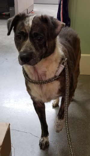 “Baylee” is a female pit bull terrier has a short brindle and white coat.