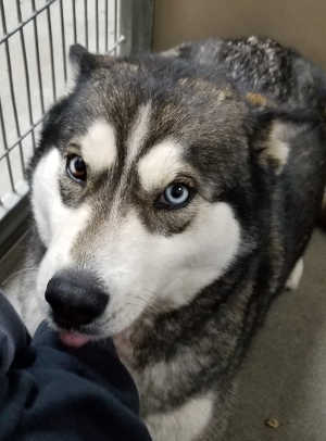 This Siberian husky of undetermined gender has a medium-length tricolor coat with blue eyes.