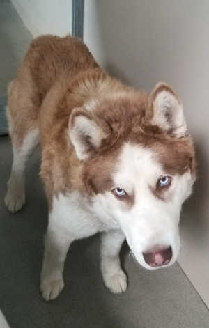 “Pork Chop” is a male husky with a medium-length red and white coat.