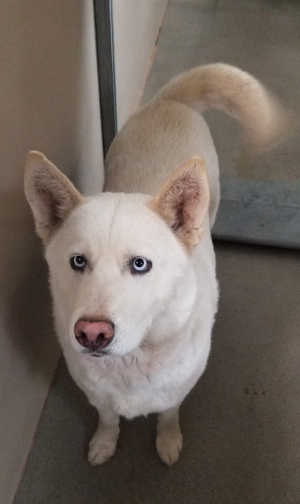 “Plia” is a female husky with a medium-length white coat and blue eyes.