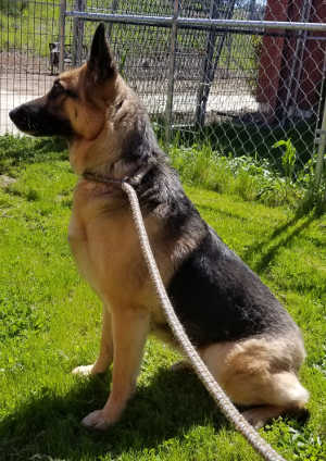 “Abby” is a female German Shepherd with a medium-length black and tan coat.
