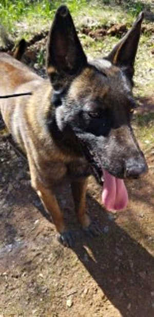 “Scout” is a male Belgian Malinois with a medium-length smooth brown and black coat.