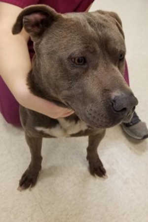 “Wynn” is a male American Staffordshire Terrier with a short brindle coat.